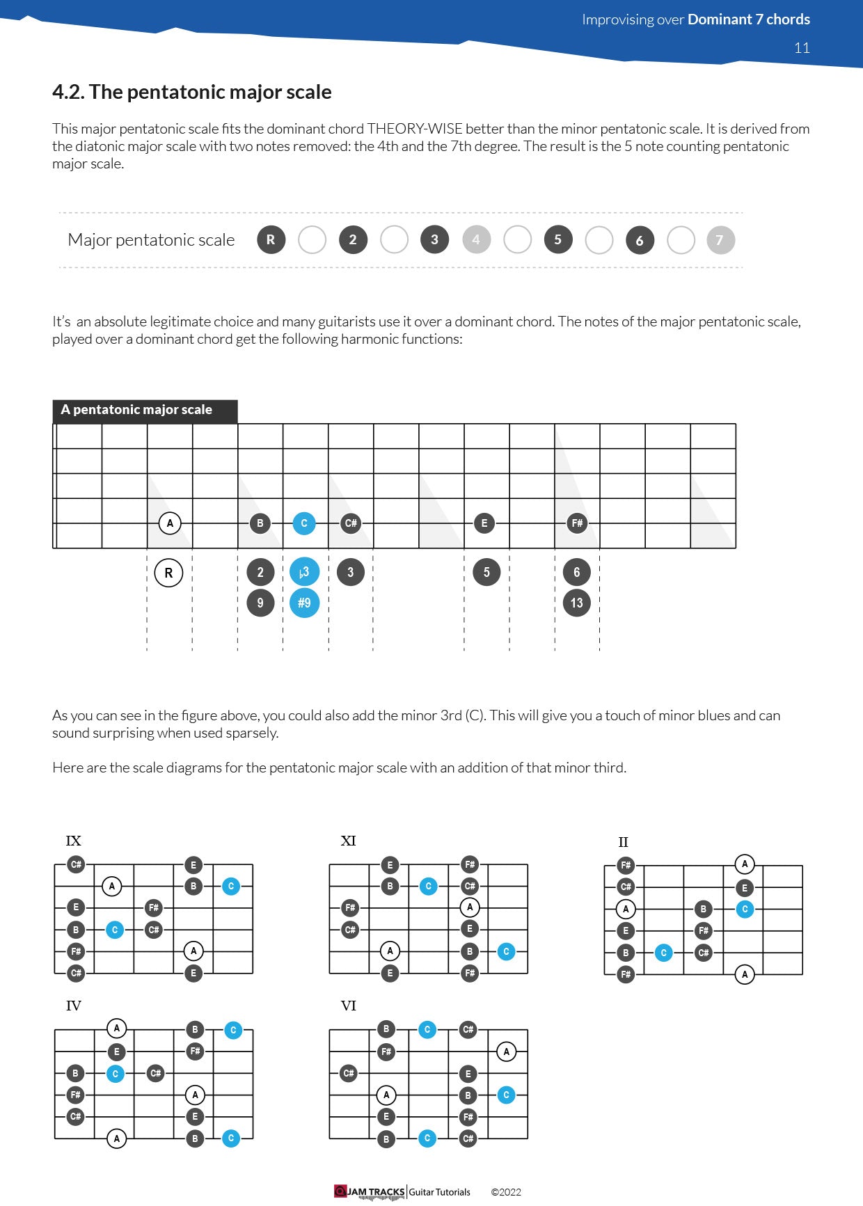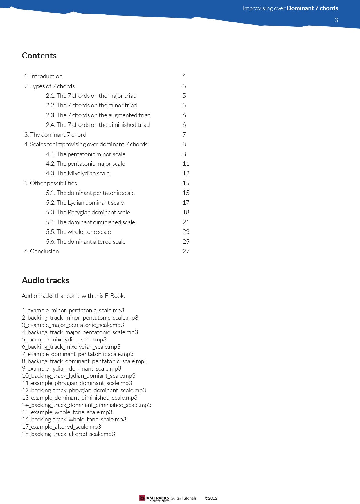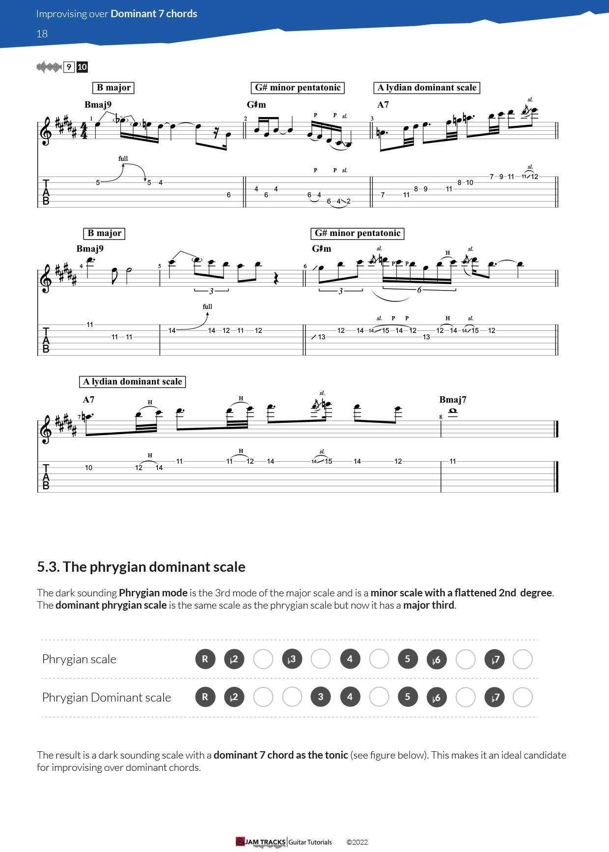 In this e-book you'll learn interesting ways to improvise over dominant chords by using different scales. This is applicable to Jazz, Fusion, Blues and Rock. The scales vary from the simple major pentatonic scale and minor pentatonic scale to the dissonant dominant altered scale. In between we'll find other possibilities like mixolydian scale, dominant pentatonic scale (or dominant 9 arpeggio), lydian dominant scale, phrygian dominant scale, dominant diminished scale (or half-whole diminished scale) and the whole tone scale.