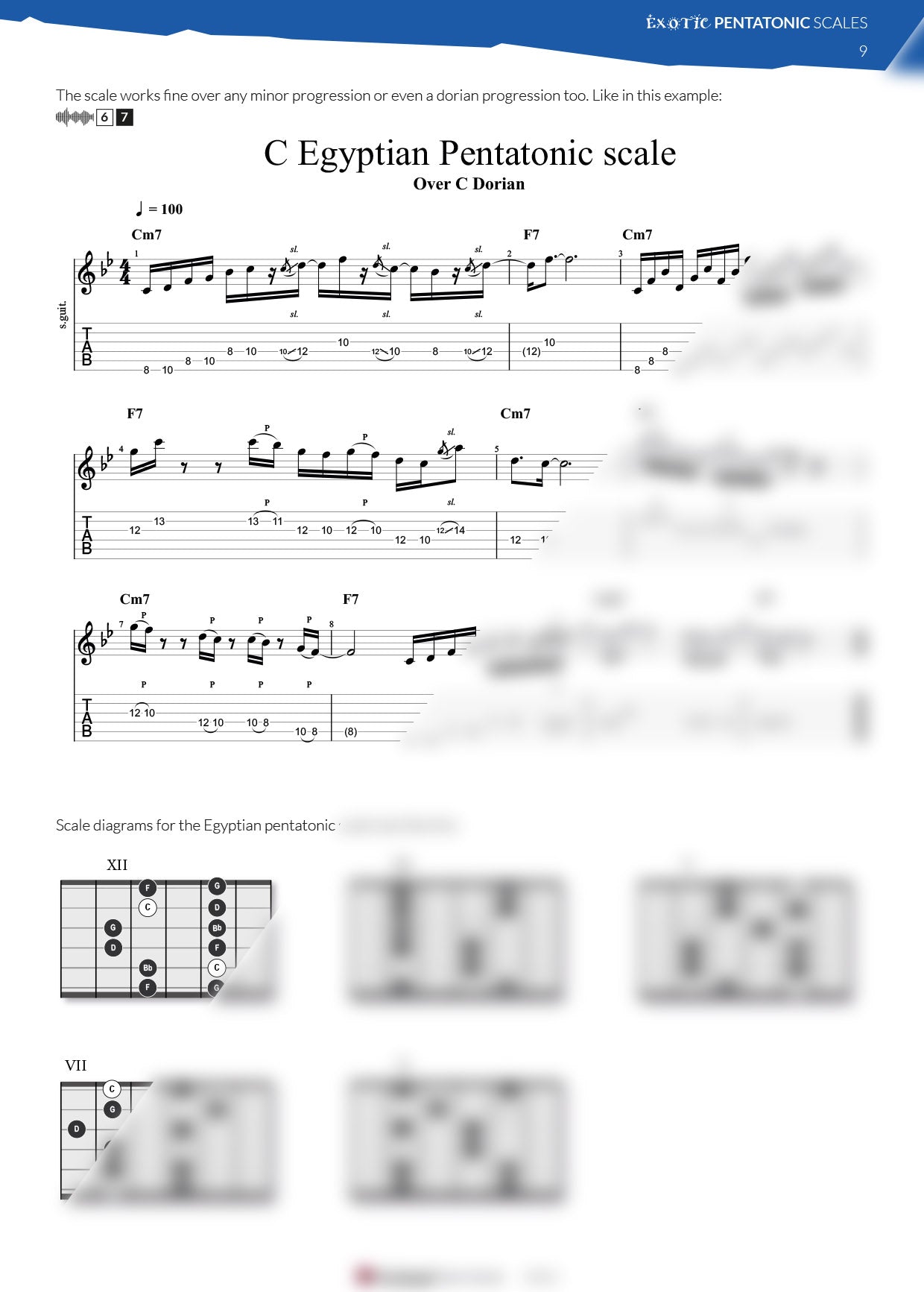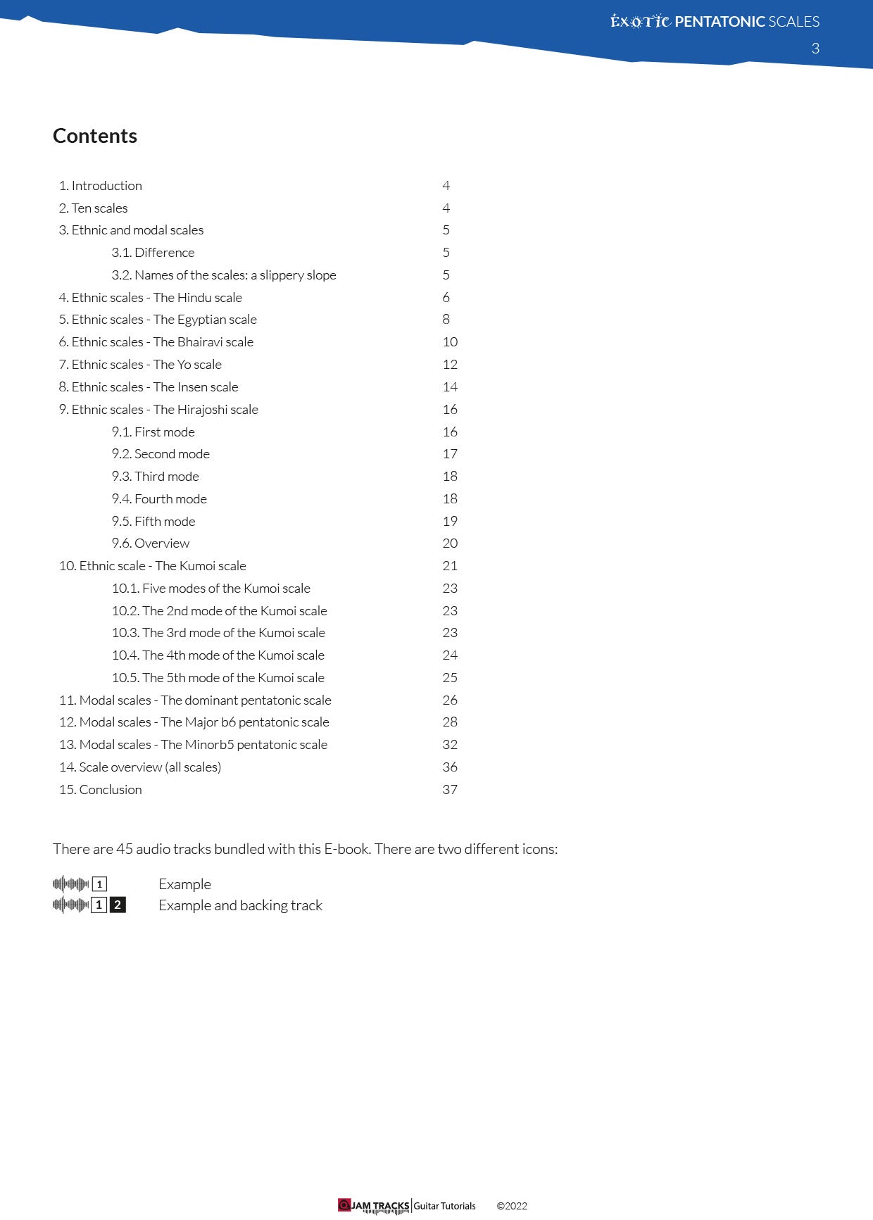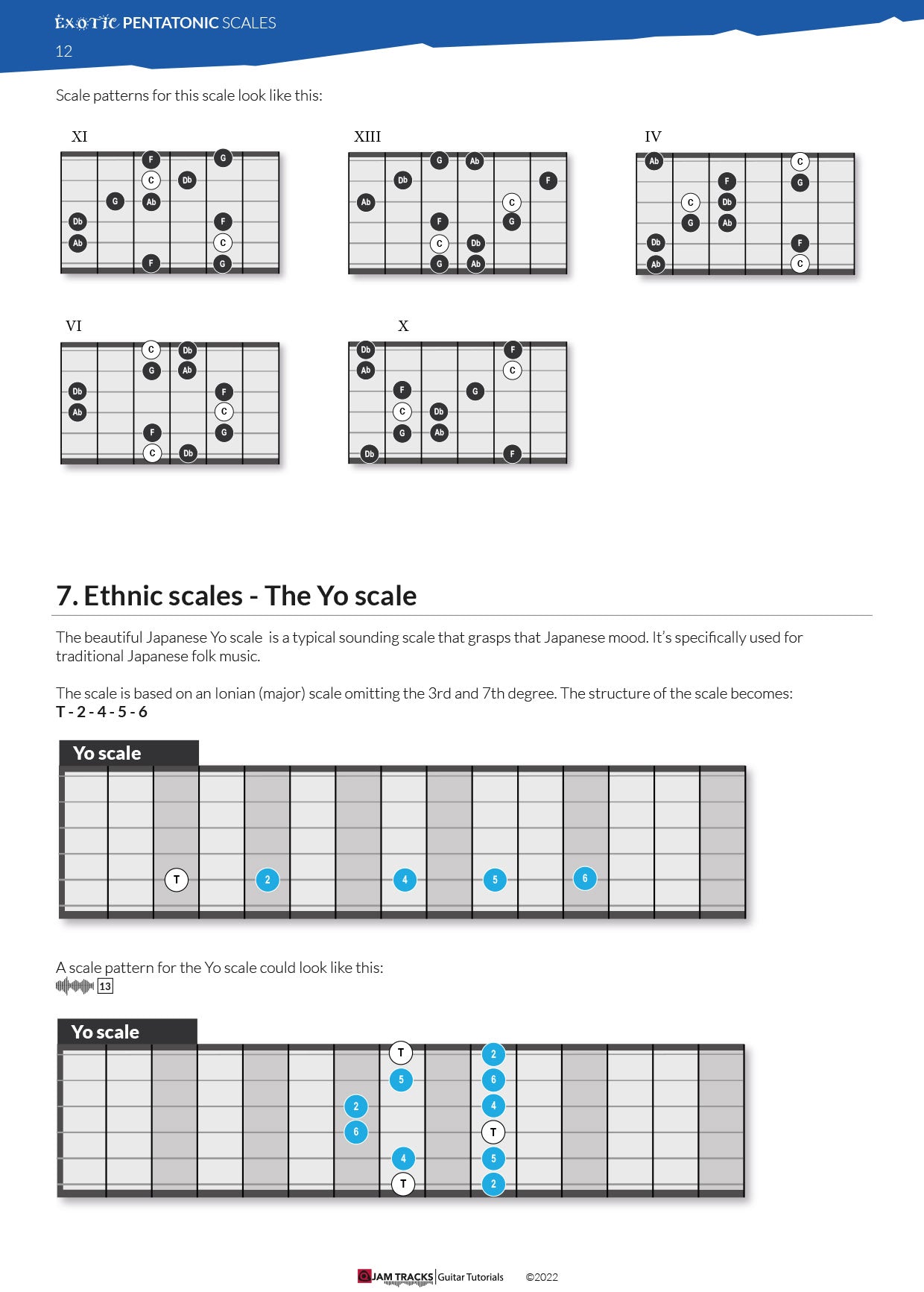 In this e-book we'll explore ten exotic Pentatonic scales that can be used in many ways. We'll see ethnic scales like the Indian Hindu scale, Egytian scale, Indian Bhairavi scale, the Japanese Yo and Insen scale which is used for tuning a Koto. Then there is the better known Hirajoshi scale and the 5 modes. Also the Kumoi scale has 5 modes. After this we loo a t the more western special Pentatonic scale like the Dominant Pentatonic scale. major b6 and minor b5 Pentatonic scale.