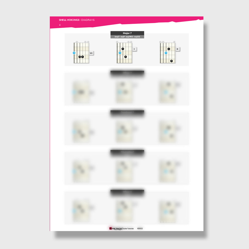 In this chord chart you'll find all diagrams for the shell voicings that let you play all extended Jazz chords with just 8 simplified shapes. Every shell voicing shape is shown in three variation with the root on the 6th, 5th and 4th string.