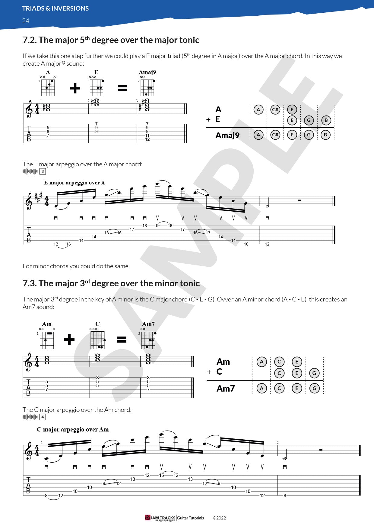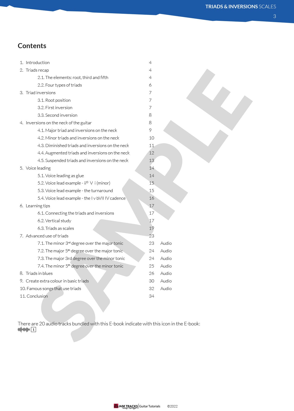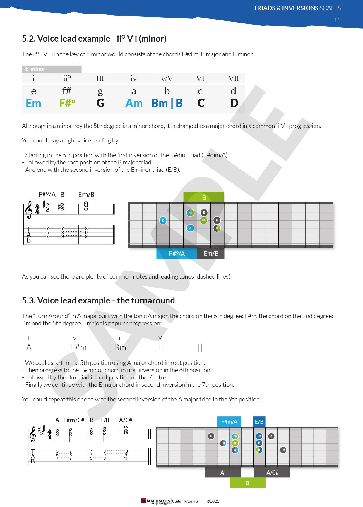 In this e-book we explore the different triads and their inversions, like the major triad, minor triad, diminished triad, augmented triad and suspended triad. We look at the root position, first inversion and second inversion of these triads on the neck of the guitar.